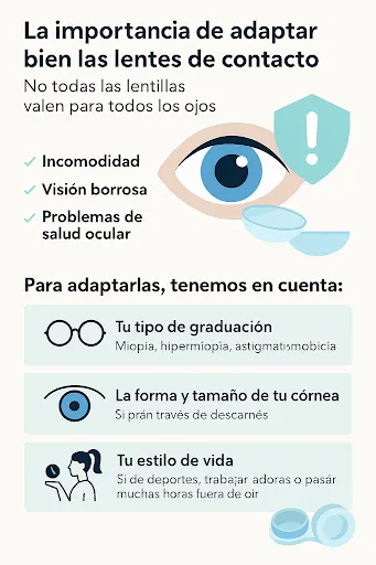 Las lentes de contacto son una opción cómoda, estética y segura para corregir la visión, pero su adaptación debe ser personalizada. Usar lentillas mal adaptadas puede generar incomodidad, visión borrosa o incluso problemas de salud ocular como sequedad, irritación o infecciones.